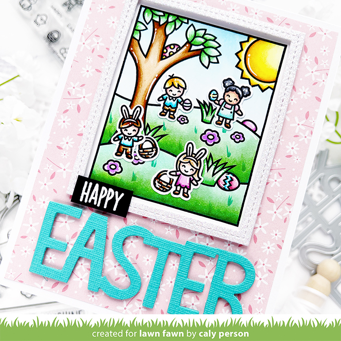 I die-cut the Giant Happy Easter die using Aqua Texture Canvas Cardstock and clipped off the word “Happy” to fit it under the window scene.