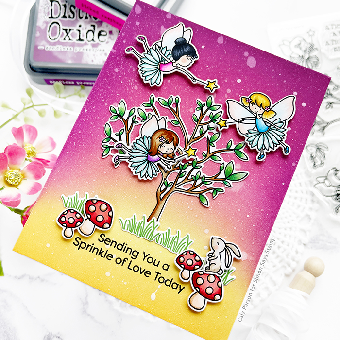 My second card uses the Fairy Special set. I wanted this card to have a magical feel so I began by ink-blending my background with Distress Oxide Inks. On a white panel, I ink-blended Seedless Preserves, Picked Raspberries, Squeezed Lemonade, and Spiced Marmalade. I splattered again with water and white paint to give it texture.