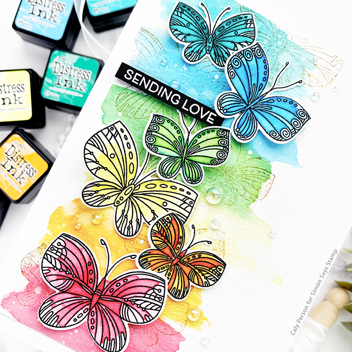 My first card today uses the Winged Wonders set. This is a 4” x 6” stamp set with 6 different butterflies and I’ve used them all for my card. I wanted to do a rainbow mixed media design (as mixed media as I can get without getting too messy, ha!). I started off with watercolor washes over watercolor paper using distress inks.