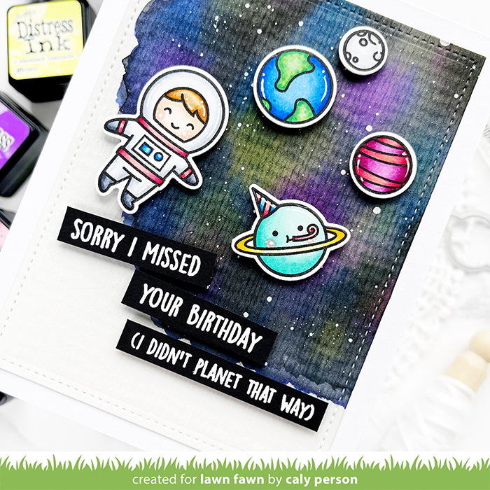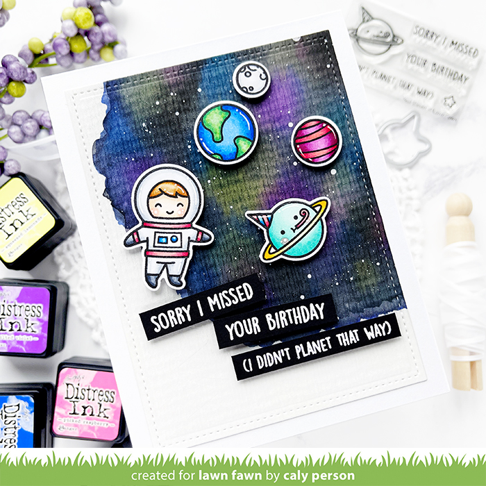 Every year for Lawn Fawn’s birthday, they design and release a mini stamp set to celebrate. Today’s Inspiration Week product highlights are the Year Eleven and Year Twelve sets. My card today uses Year Eleven and I’ve combined it with the Out of this World set to make a galaxy card.