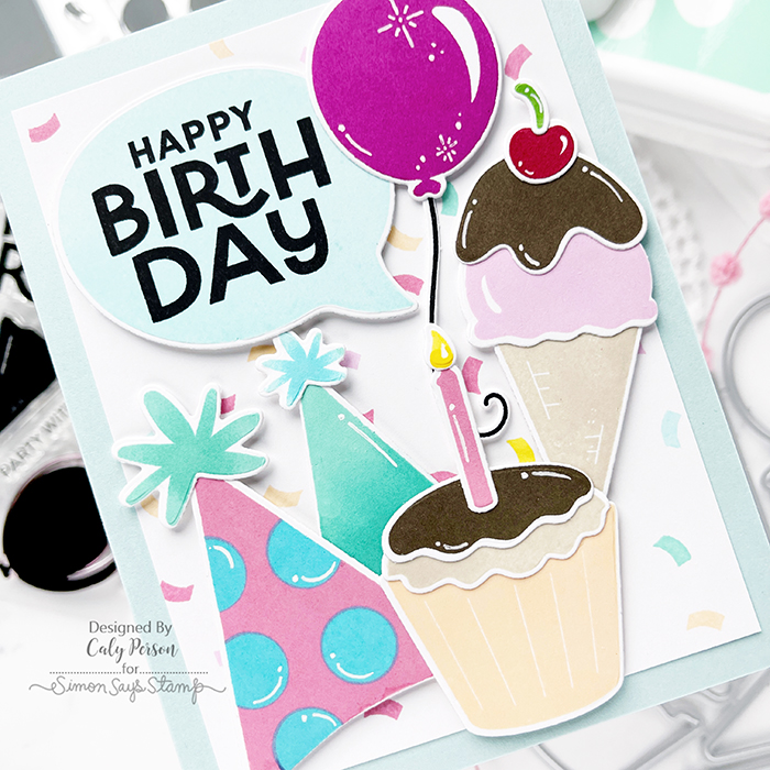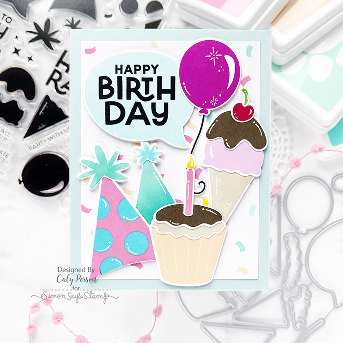 I have another card to share today using products from the Simon Says Stamp Happy and Joyful release. Today’s card uses the Time to Party set. It’s a fun 6″ x 8″ set with large party icon stamps to create a festive card. I stamped nearly everything from the stamp set to showcase on my card today.