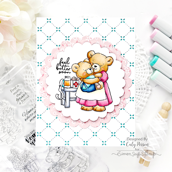 My background uses the Quilted Backdrop die. I layered it over some Audrey Blue cardstock for some color. For the image, I die-cut and stacked some Scalloped Circle Stackables. I used a pink sheet of Flower Market patterned paper to layer the scalloped circles.