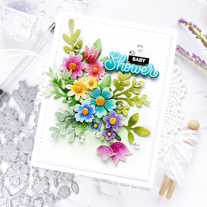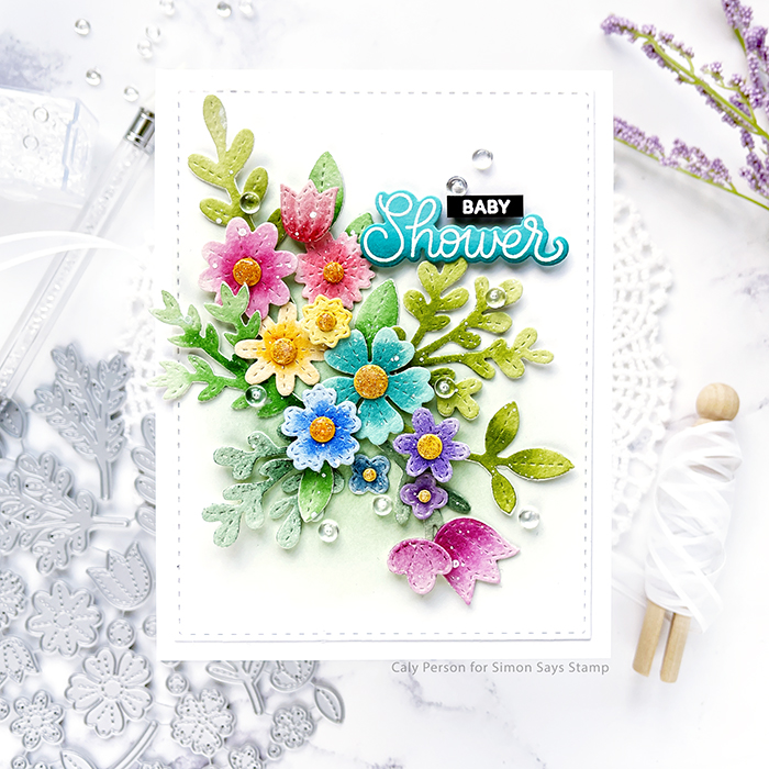 For the background, I die-cut a stitched white panel and ink-blended it with some green ink before creating my floral spray. Then I used the stamps and dies from the Celebration Scripts set for my sentiment. I went to a “wildflower” baby shower and this card was perfect for the occasion! I finished by embellishing my card with 4mm Clear Droplets.