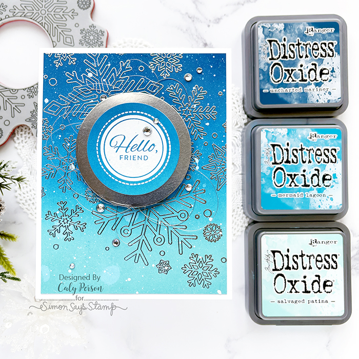 I ink-blended a panel using the new Uncharted Mariner Distress Oxide ink with Mermaid Lagoon and Salvaged Patina to show the gradient in color for comparison. Of course, I had to make a card out of this panel and it reminded me of winter and snow! So here is my first winter card…too soon?