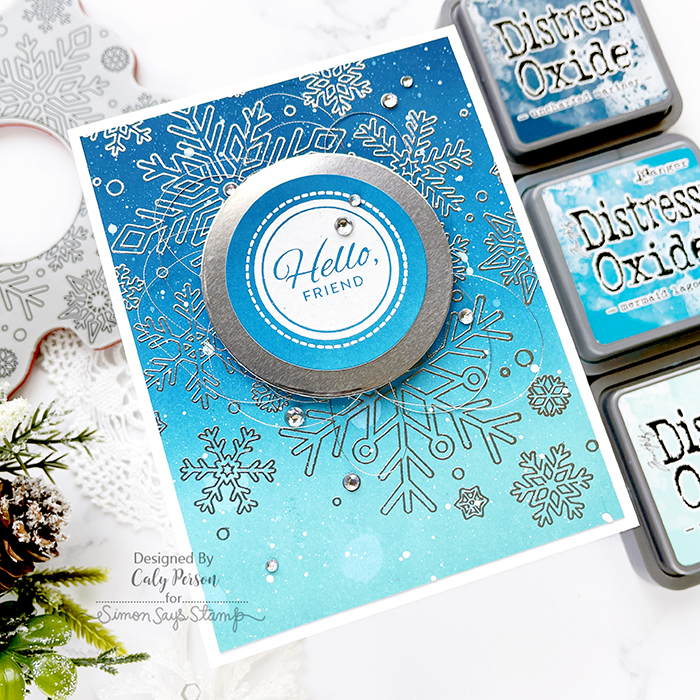 The sentiment is from the Snowflake Season set that I embossed in white over the the piece that I die-cut out of the center from the Center Cut Snowflakes. There is a winter sentiment with the Center Cut Snowflakes set, but I wanted something more generic so I opted for the “hello, friend.” Then, I used another Nested Circles to die-cut a bigger circle using Matte Silver cardstock.