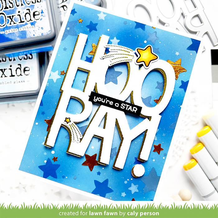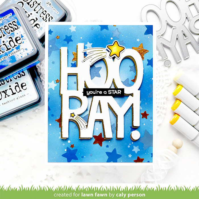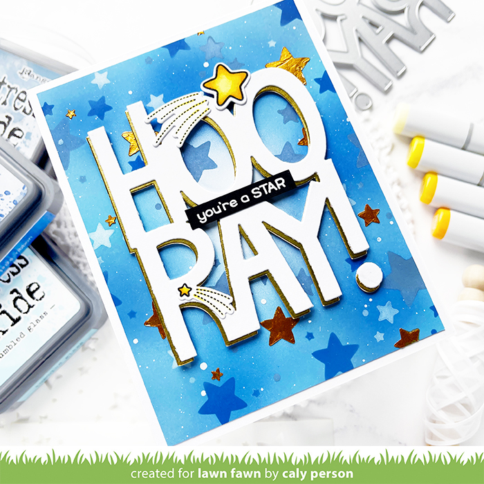 Today’s Lawn Fawn Inspiration week card features the Giant Hooray die as well as the Lots of Stars Background Stencils. It’s easy to combine these two projects for a congratulatory card!