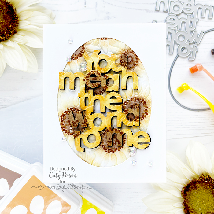 For my spotlight effect, I used the You Mean the World to Me die and die-cut it in Lemon Chiffon cardstock, then I embossed it. I then ink-blended and colored it as I did before to mimic the exact look as on my full sized panel. Because I die-cut my base layer in yellow, I also started with the Cantalope ink and intensified the colors to give it more focus.