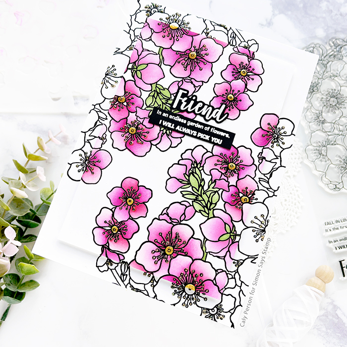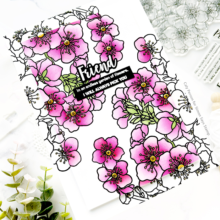 The second card I made uses Captivating Blooms. It’s a large image that would full cover an A2 card. My card today is a 5″ x 7″ card so I stamped two panels exactly the same and embossed it with clear embossing powder. I used the Captivating Blooms Stencil Set to ink one of the panels.