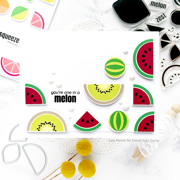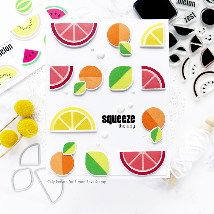 I stamped so many images, so I separated them into citrus fruits and melons. My first card is a citrus card. Because the images were the same height, I decided to make my card more graphic. I evenly spaced the images and lined them up to adhere with foam adhesive.