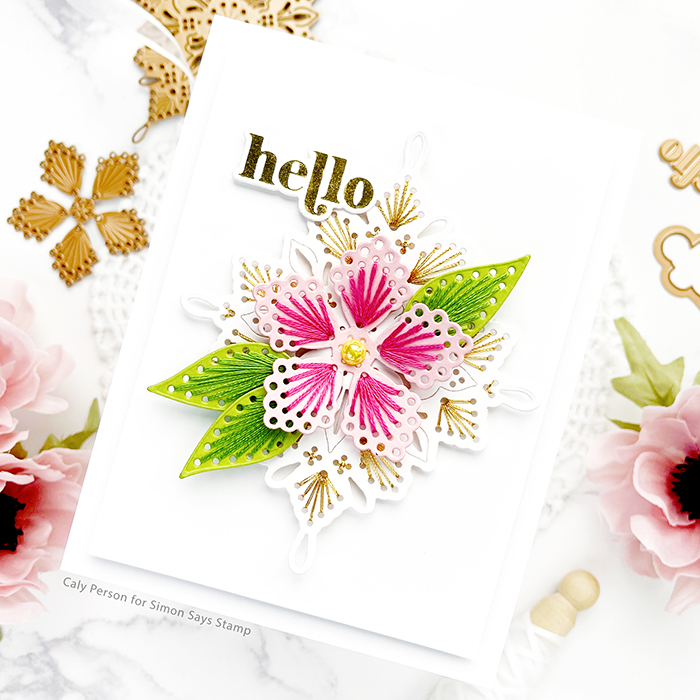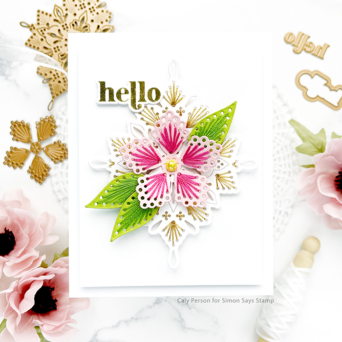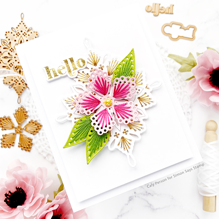 Today’s project uses the Stitched Flowers die as well as the Stitched Medallion die. I layered them to create dimension and interest. For the Stitched Flowers die, I die-cut the images in pink and green cardstock and stitched them with coordinating thread. For the Stitched Medallion die, I die-cut it in white and stitched it with gold thread. All the stitching is done with 3 strands.