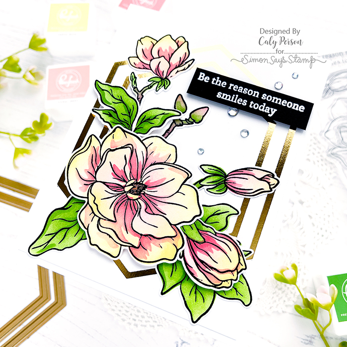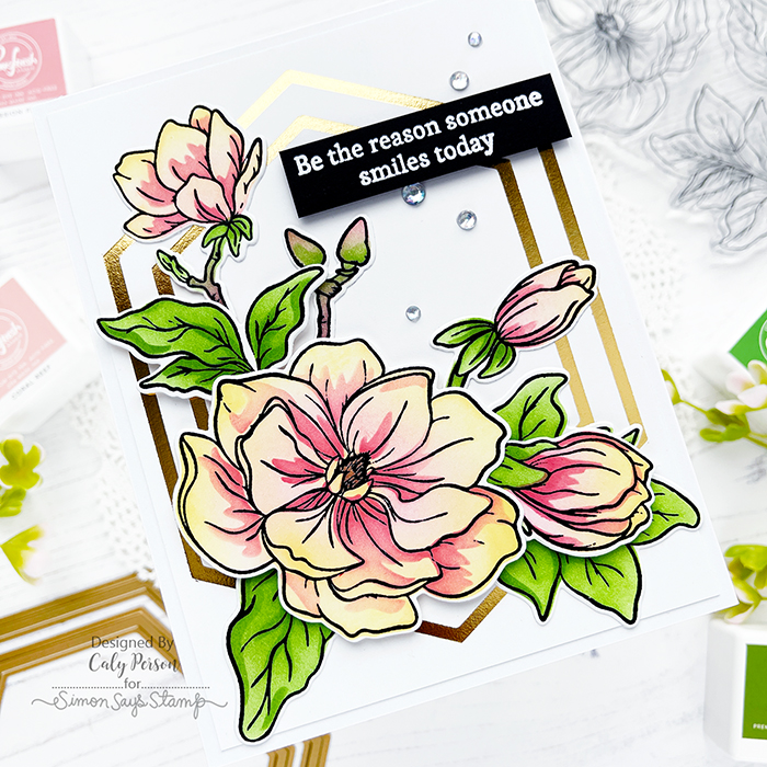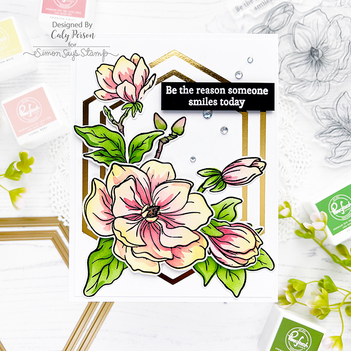 I was on the Simon Says Stamp Blog and YouTube Channel yesterday and am sharing my project with you here today. Today’s card features the Magnolia stamp, die, and coordinating stencils. I love adding color without markers or paint. Stencils just make everything easy with how you can blend colors and I’ll be inking my magnolias with corals and yellows.
