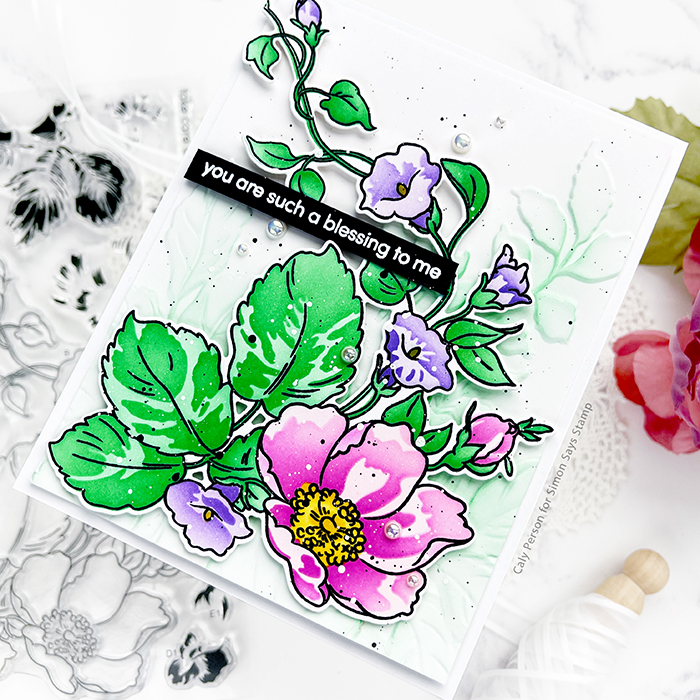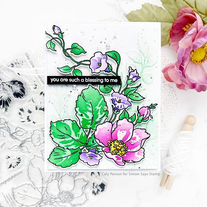 The coordinating die is so nice because it allows me to add dimension to my card. Since this kit comes with an embossing folder, I went ahead and embossed my background for more interest. I lightly ink-blended over the top with Sweet Leaf Ink to give it some color too. I attached my image with foam adhesive and splattered it with white and black paint and then finished with a sentiment strip.