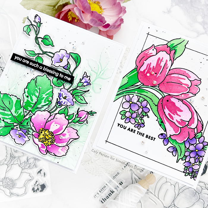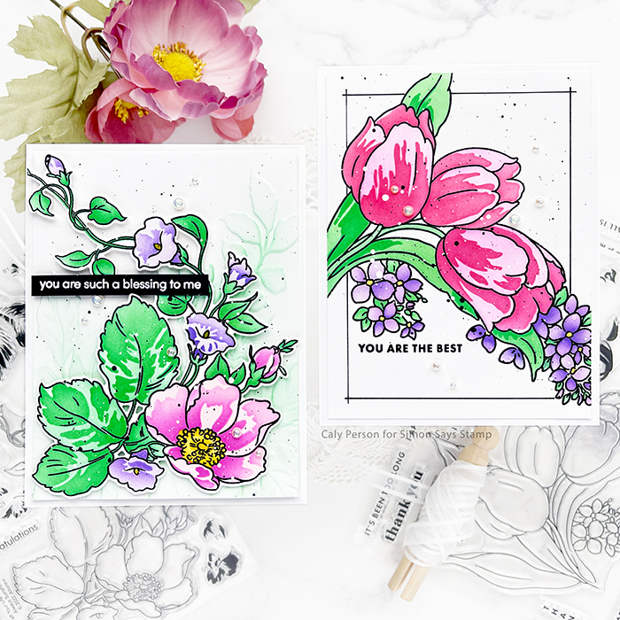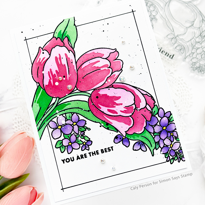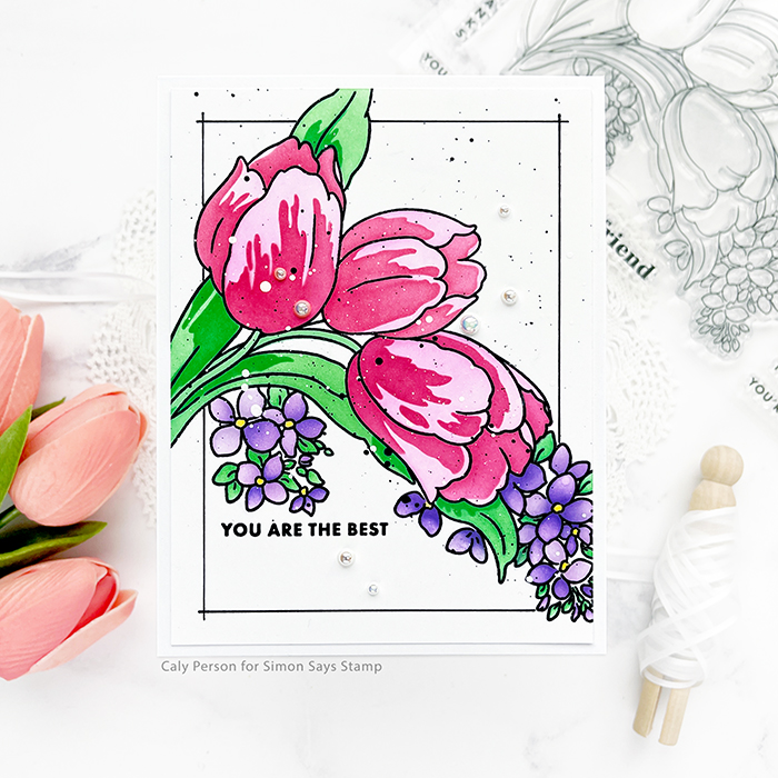 My second card uses the Build-A-Garden Tulips & Friends set. This set is more simple and comes with just the stamp and stencil set. So created a one-layer card that is still just as colorful and impactful. I started the same way by embossing the stamped image and ink-blending using the coordinating stencils.