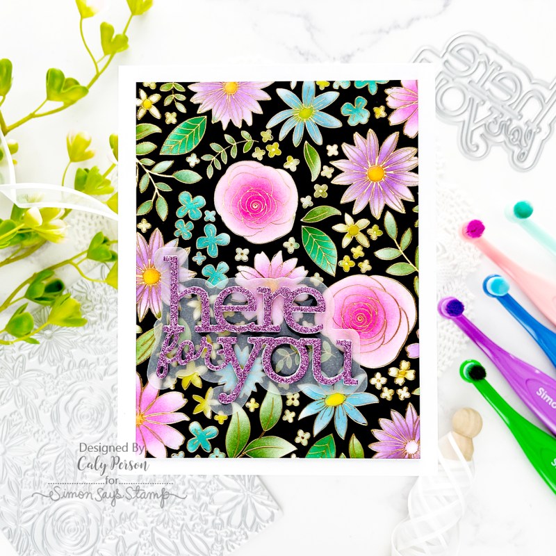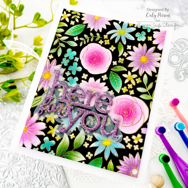 I tried something new for today’s card and I’m excited to share it. I’ve used the Intricate Floral Background Hot Foil Plate before and ink-blended it to give it color. You can view that card HERE. Today’s card is a colorful take on a foiled background.