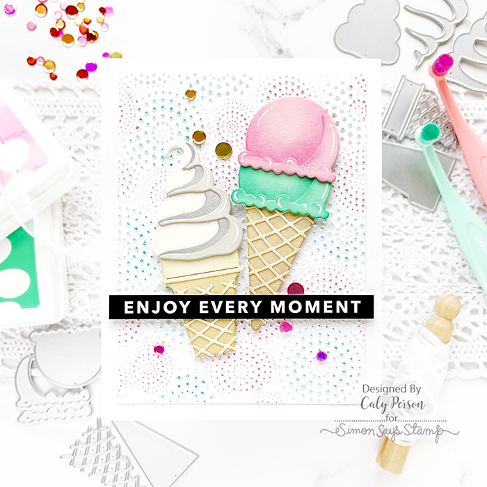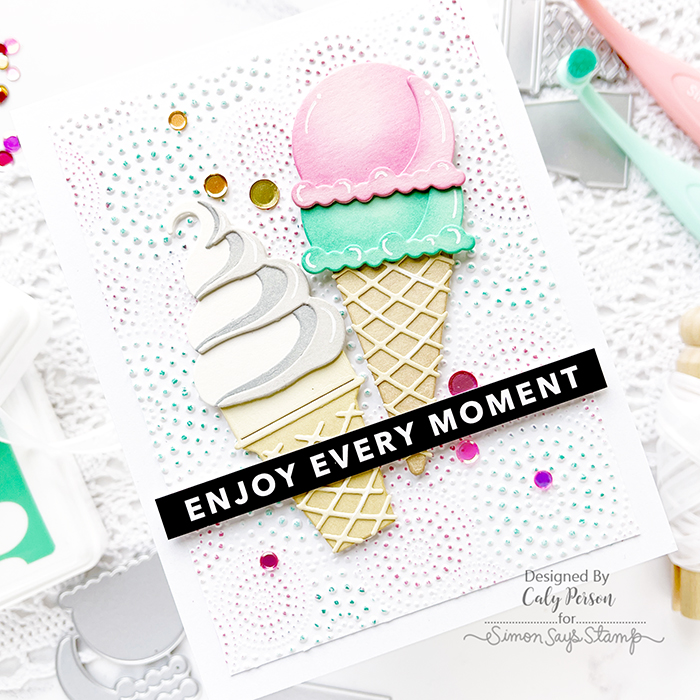 Next, I die-cut my Soft Serve Cone and Ice Cream Scoop and Cone using Ivory, Cream, Cotton Candy and Mint cardstock. I ink-blended each layer with a coordinating ink to give them dimension (they’ll be linked below, if you’re interested in the exact colors I used). Once I assembled my ice cream, I attached them over the embossed background panel with foam adhesive for dimension.