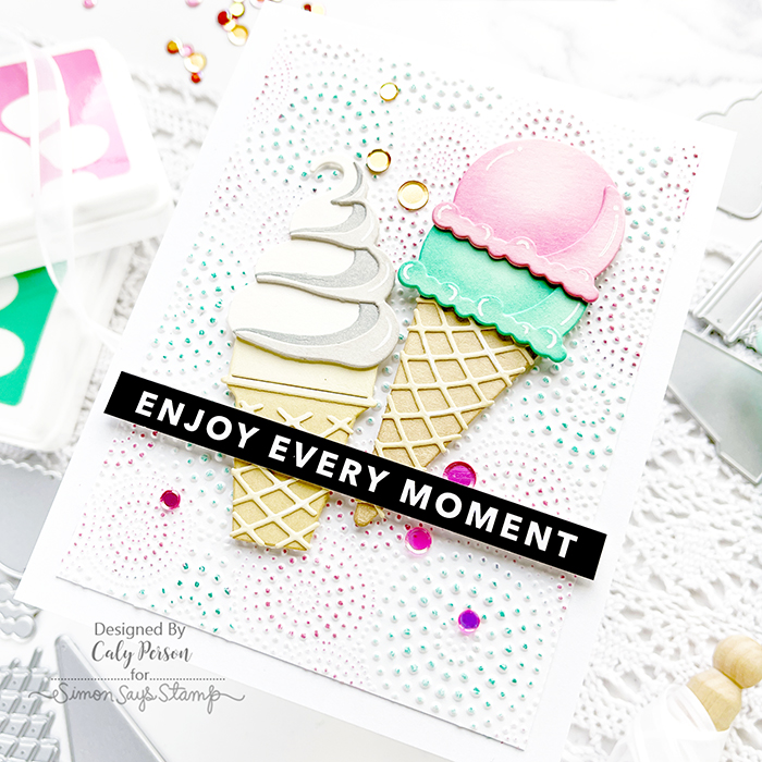 My card today features the new Dibble Dot Embossing Folder, Soft Serve Cone, and Ice Cream Scoop and Cone. After embossing a white panel with the Dibble Dot Embossing Folder, I used Guava and Tropic ink to rub ink onto the embossed areas with my index finger. I’ve never done this before, but it gives the raised areas some color with color.