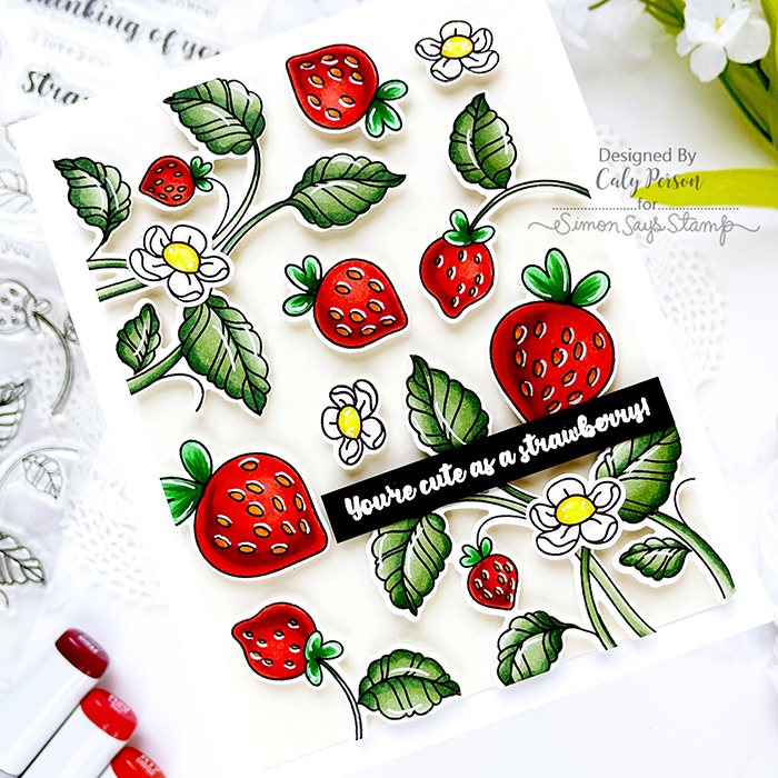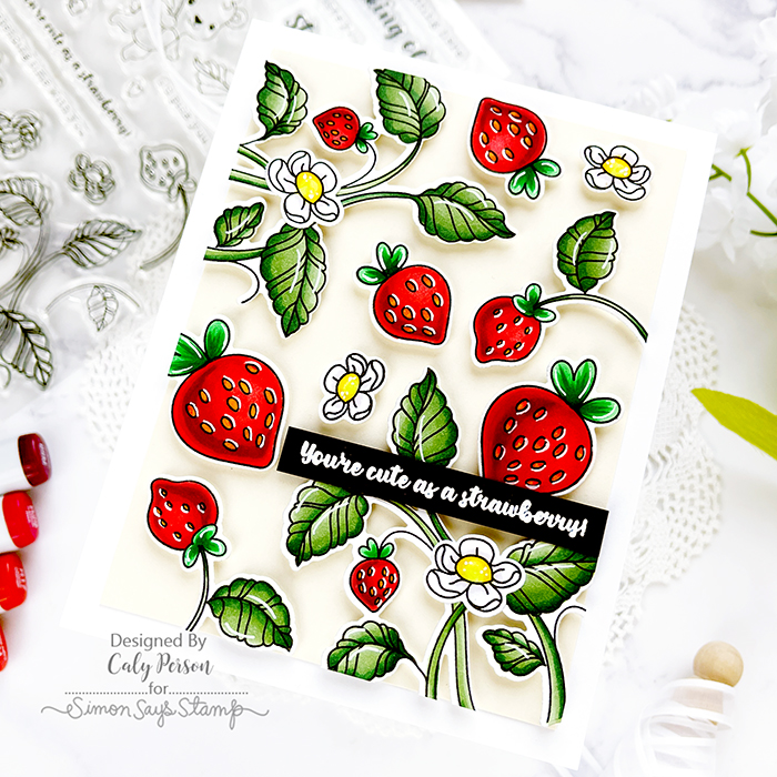 Today’s card features the Strawbeary set from the previous Simon Says Stamp Yay You release. It’s illustrated by my talented friend, Alberta Gava. If you are familiar with his work, you know how talented he is with Copic markers. This set has bears it in (hence, it’s name), but I love the strawberries and foliage so much, I wanted to create a background with the images.