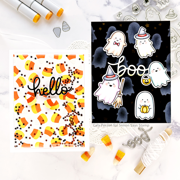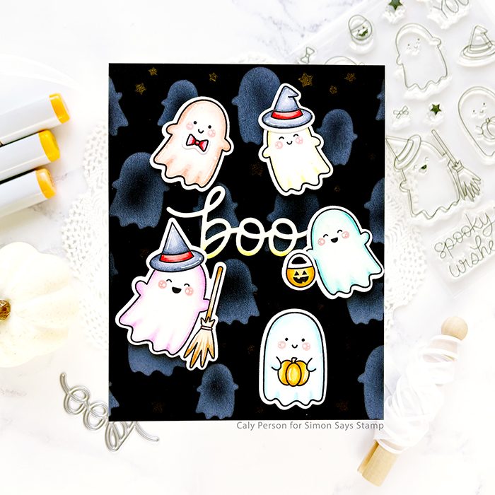 My first card features the Ghost Friends stamp set. I stamped and colored them with Copic markers before setting them aside to work on a background. For the background, I used the Layered Ghosts stencils. There are three layers. A layer with the ghost shapes, a layer with ghost faces which I didn’t use, and a layer of stars. I applied white pigment ink for the ghosts over black cardstock, then used gold ink for the stars.