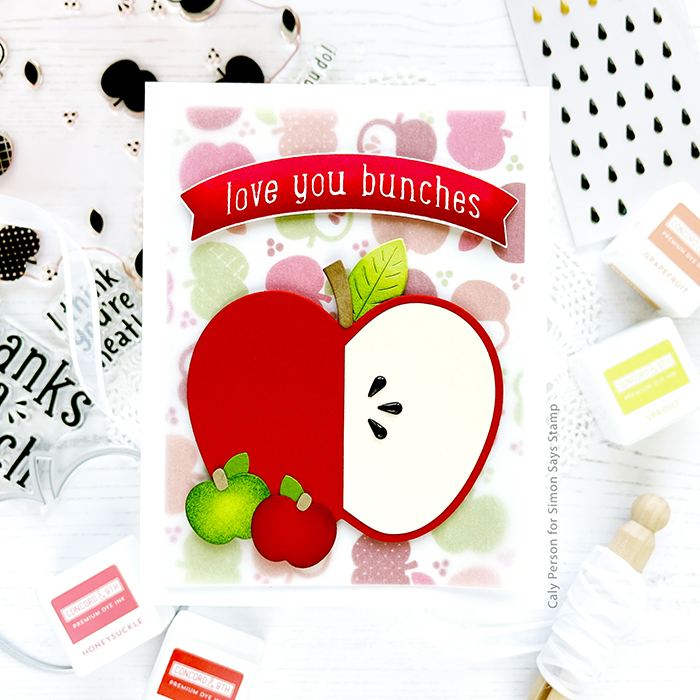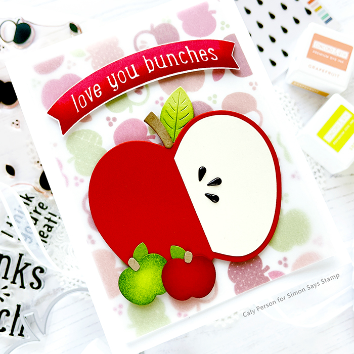 My final card for today uses the fun Apple Orchard Turnabout Stamp. The colors are a little bold so to tame it some, I layered a piece of vellum over it. I then paired it with the Apple Orchard Dies to add a large apple and sentiment.
