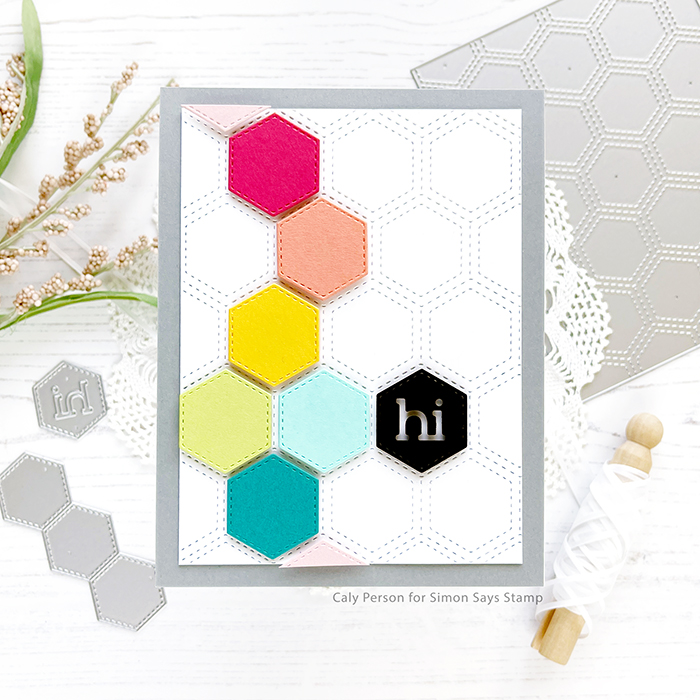 I die-cut a rainbow using Concord & 9th cardstock and then finished with a simple black hexagon with the word “hi” in it. I popped all the hexagons over the white panel with foam adhesive to give it more dimension and interest. I matted the entire panel over a piece of Dove cardstock to keep it neutral.