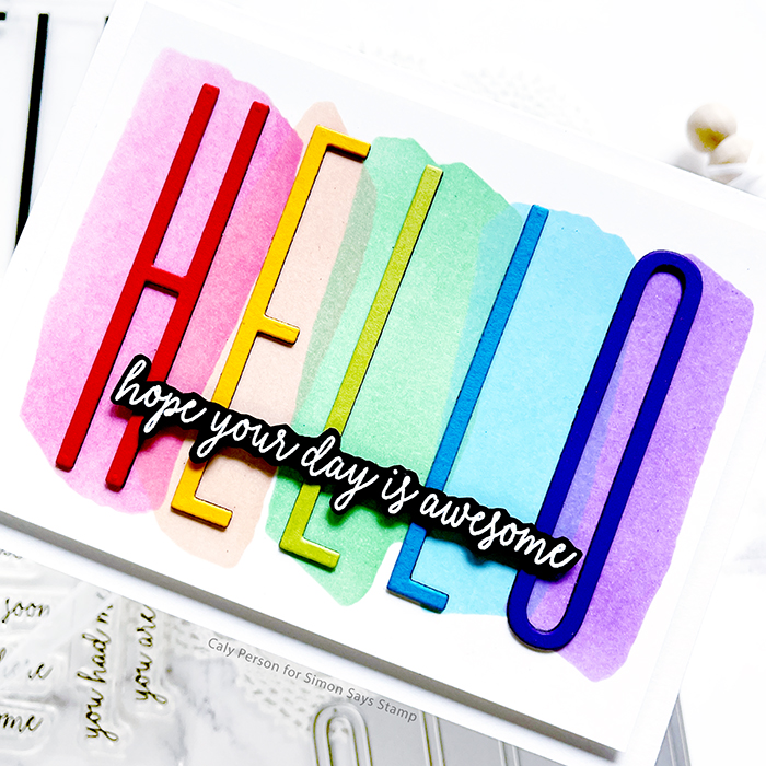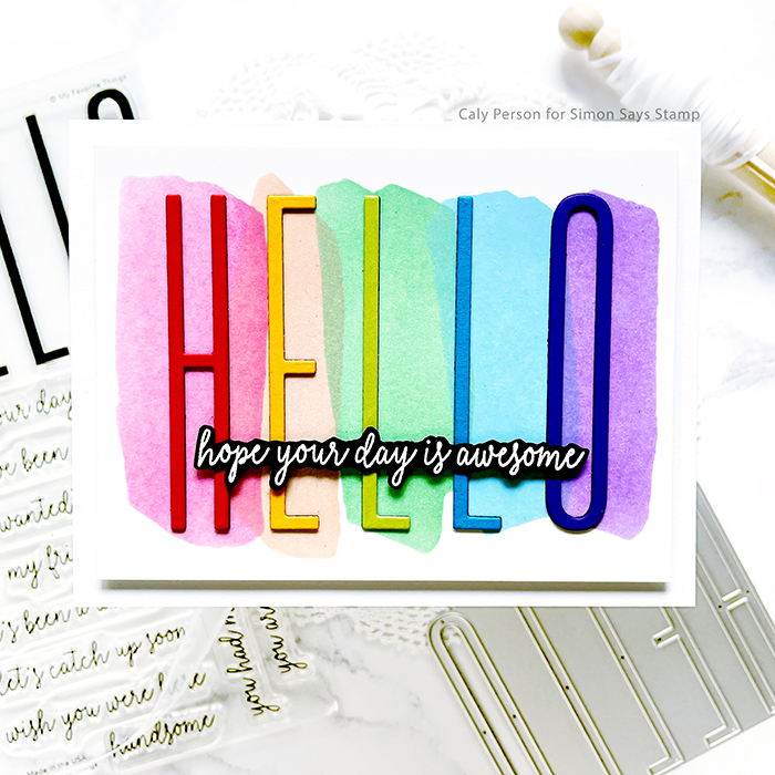 My first card is a fun and easy “hello” card. The background is created with a stencil and the letters are simply die-cut.