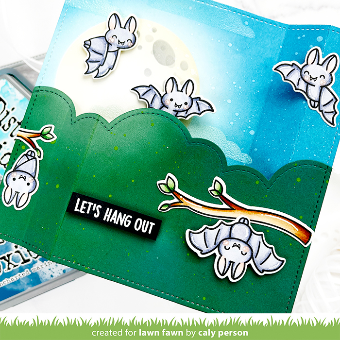 I stamped and colored images from the Fangtastic Friends and Fangtastic Friends Add-On sets with Copic markers. For yesterday’s card, I colored them with cool grays. For today’s card, I went with Blue-Violets. I wanted me scene to be a canopy of trees with the bats enjoying the dark night with my pop-up bat coming out of the canopy.
