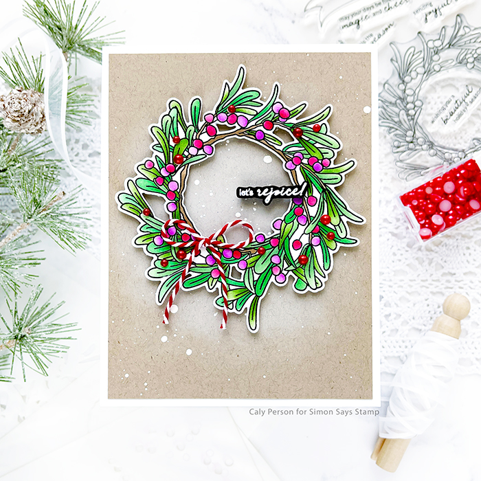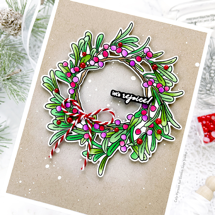 I ink-blended my images using the Mistletoe Wreath Stencils in 3 different shades of green and 2 shades for the berries. After adding color, I die-cut my image moved onto the background. On a kraft cardstock panel, I blended on some white pigment ink and splattered it with white paint. I then attached my wreath image.