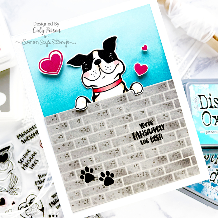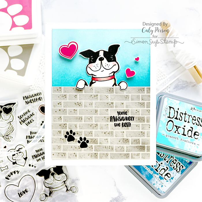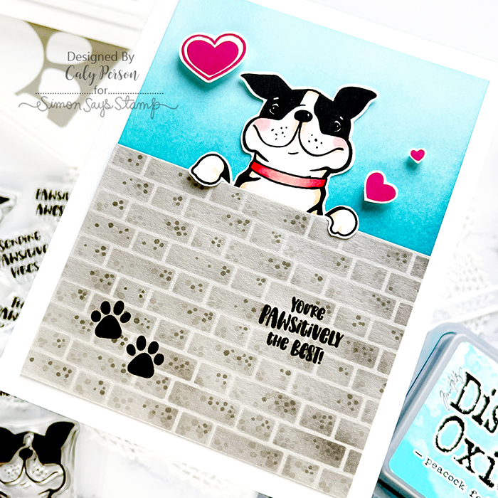 I just love the puppy image in the bottom right – he looks like he’s peeking over something, so I used a brick stencil to make a wall for him. Over some fog cardstock, I ink-blended some light gray ink and then gave it texture using some gray Copic markers (W2, W5).