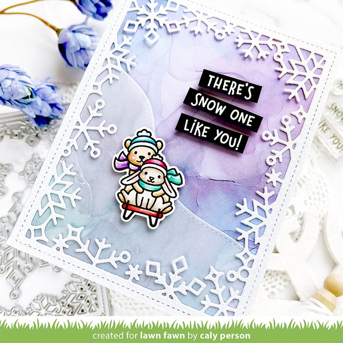 I have a simple card to share today. The background looks complicated, but it’s patterned paper! So easy and convenient. I love playing with alcohol inks, but when I’m in a time crunch, I love the ease of alcohol-printed backgrounds! Today’s card features the Snow One Like You set – it’s a mini set so the price point is great and it’s adorable!