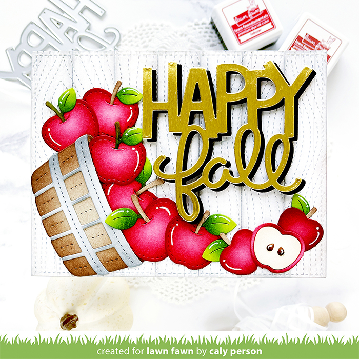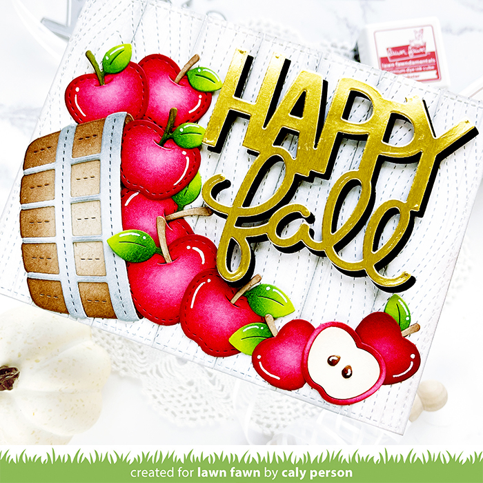 I’m switching back to a fall-themed card today for Lawn Fawn Inspiration Week! Today’s card uses the Giant Happy Fall die, so I needed to find fall products. I just loved the Build-A-Barrel: Apple die so much, I wanted to use it again.