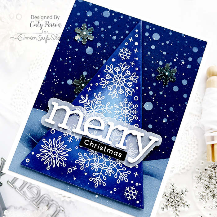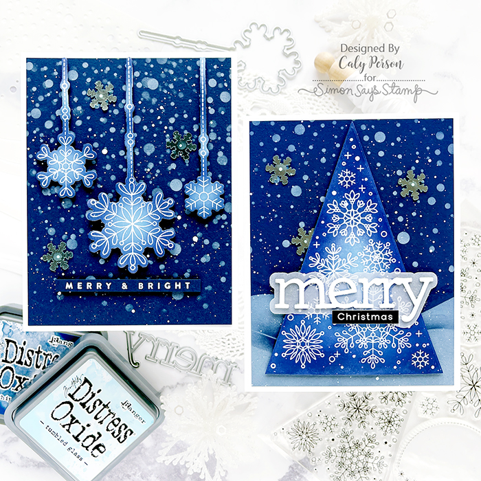 I embossed the images over white cardstock and ink-blended with Distress Oxide Inks. For the background, I used Soft Navy cardstock and added the Snowfall and Banks with white pigment ink.