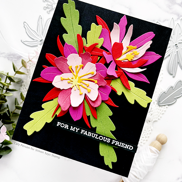 My card today features the Craft-A-Flower Epiphyllum dies. These intriguing flowers are a cacti and tropical succulent. Tugs at my cacti/succulent-loving heart! I googled images for inspiration and loved the dark backgrounds that I saw, so my card is over a black background – which is A LOT of contrast for me!