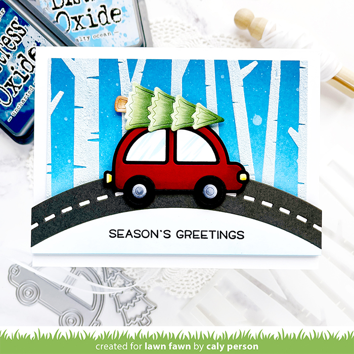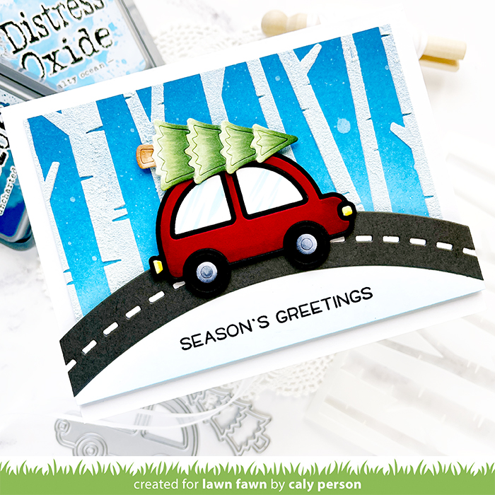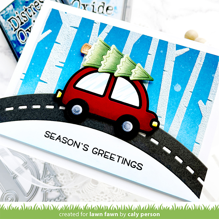 Today’s card features the Deck the Car dies and Birch Trees Stencils. Combined, they create a “through the woods” scene that’s simple, but gives you all the winter vibes! I die-cut the Deck the Car dies in white, red and black. I used Copics to color some white areas like the windows, wheels, car lights, and Christmas tree. I also used Copics for the red car’s shading. When I finished coloring, I pieced it all together.