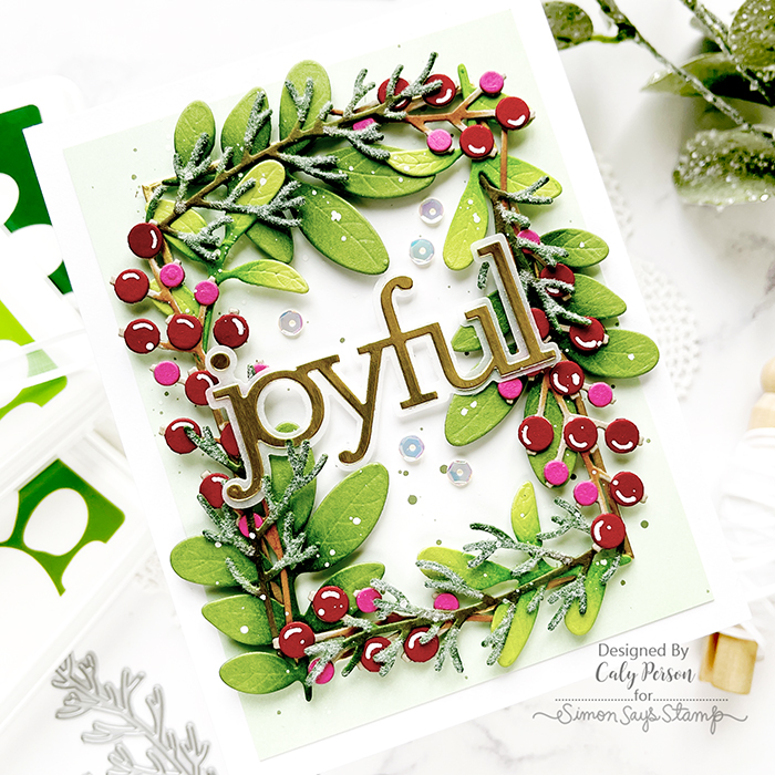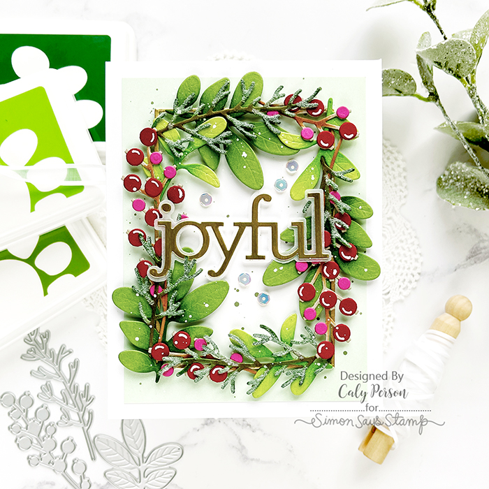 I die-cut the Berry Stems from a variety of Simon Says Stamp Cardstocks (linked below). Then to frame it, I die-cut a gold rectangle from A2 Thin Frames. Let’s just say it was used as a guide since most of it is hidden by the foliage.