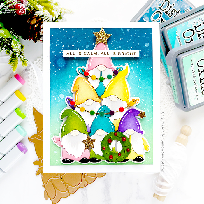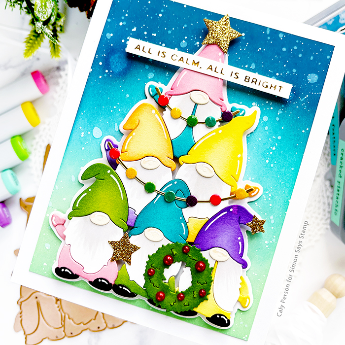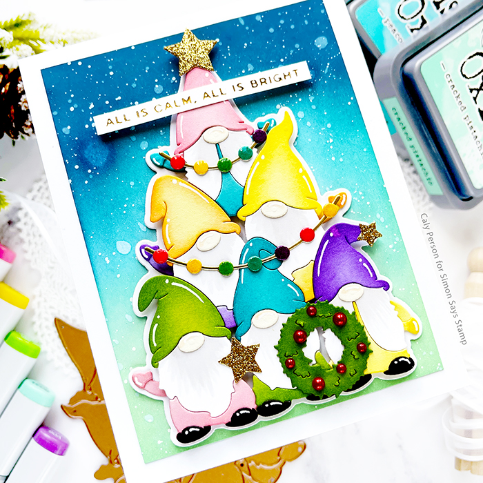 My background is ink-blended with Cracked Pistachio, Peacock Feathers, and Uncharted Mariner. I spritzed the panel with water for interest and also splattered it with white paint. I finished by attaching my Gnome Tree and added a foiled sentiment using Yana’s Christmas Sentiments set.