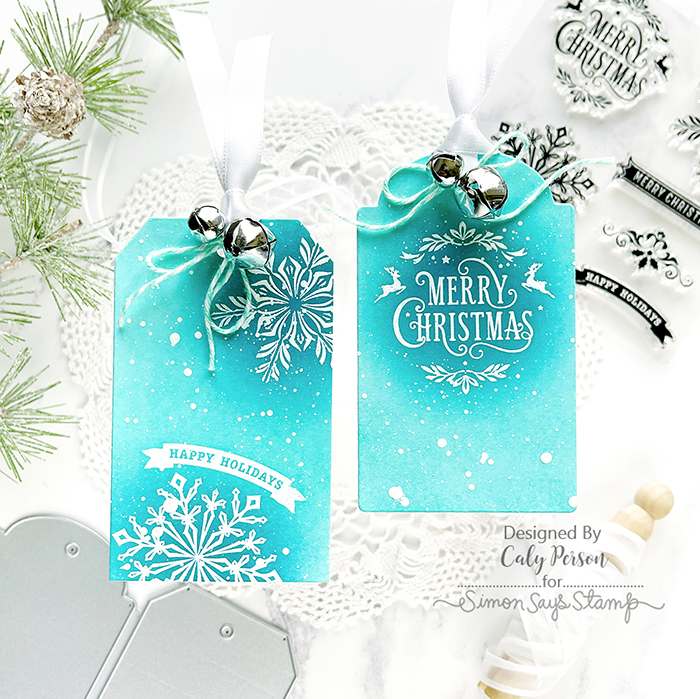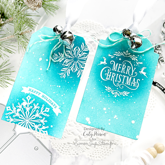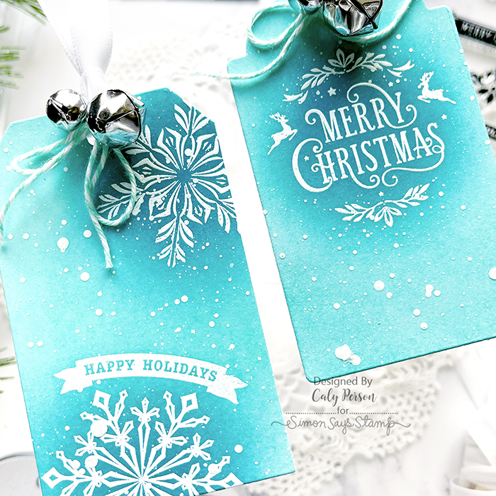 I used the stamp set to create two tags using the Large Tags from Simon Says Stamp. I embossed the snowflakes and sentiments on white cardstock. After heat-setting the embossed images, I ink-blended with Peacock Feathers and Uncharted Mariner. Here’s where you can personalize it with whatever color you’d like!