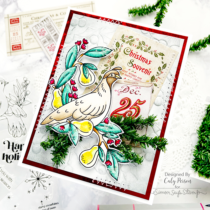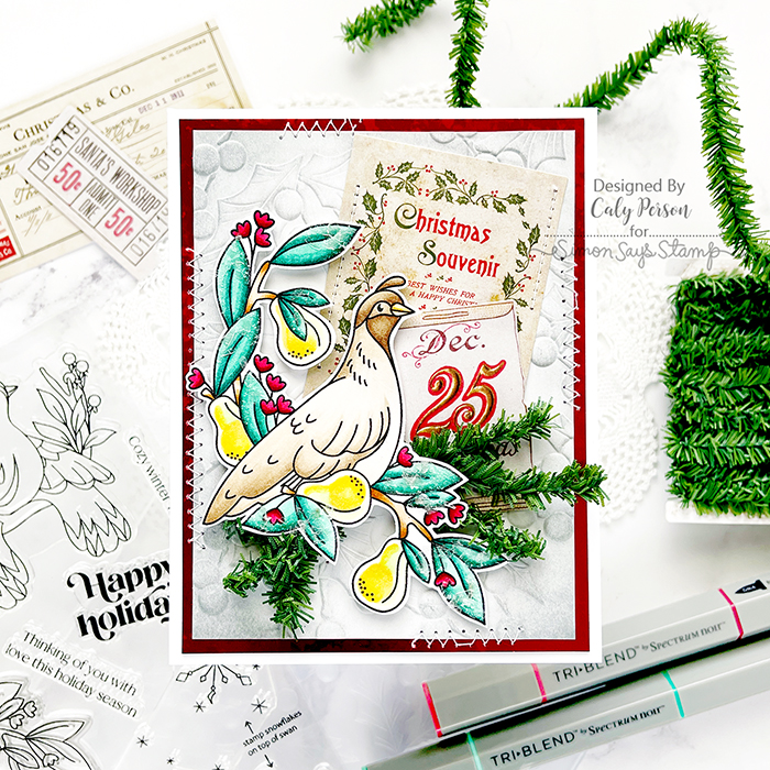 I used the Festive Feathered Friends stamp set to stamp the partridge image and colored it with the Spectrum Noir Tri-Blend Dark Red and Spectrum Noir Tri-Blend Jade Green markers. I also supplemented with Copic markers to color the rest of the image.