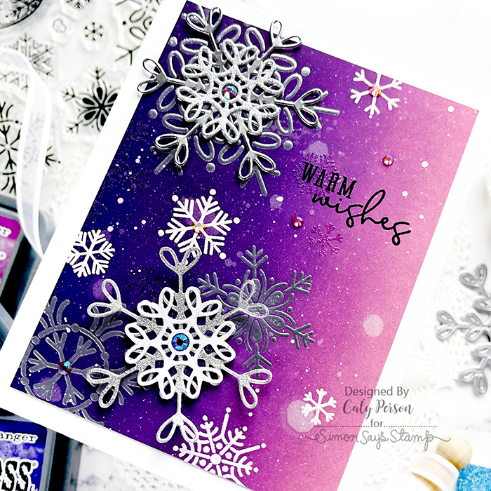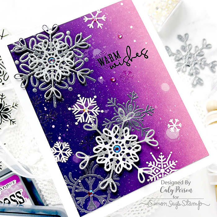 On a white panel, I embossed my snowflakes from the Snow Love set using silver, white, and clear embossing powders. I ink-blended my background with Distress Oxide Inks before splattering it with water and white paint. I also embossed the sentiment using black ink and clear embossing powder.