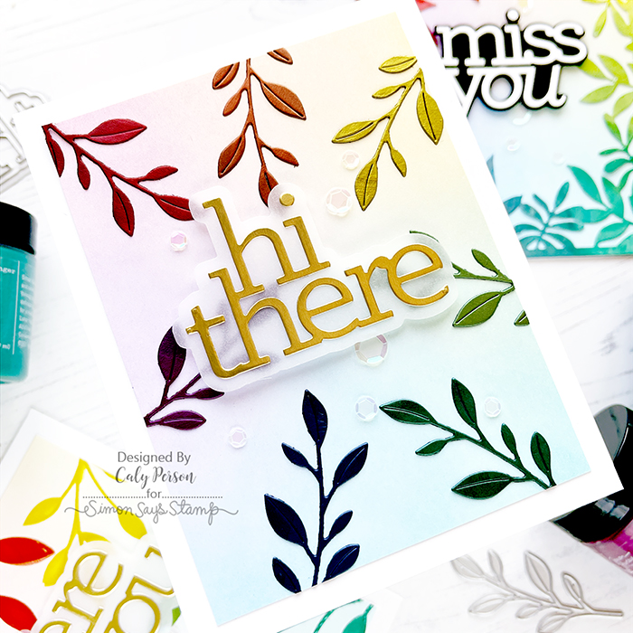 The first card uses the Lunar Pastes over dark cardstock.  I swatch them out in my video, then repurpose the swatch to make colorful die-cuts.  I used a small foliage die from the Etched Meadow Flower and Leaves Dies to die-cut each of the colors.  This card also features the Hi There sentiment.