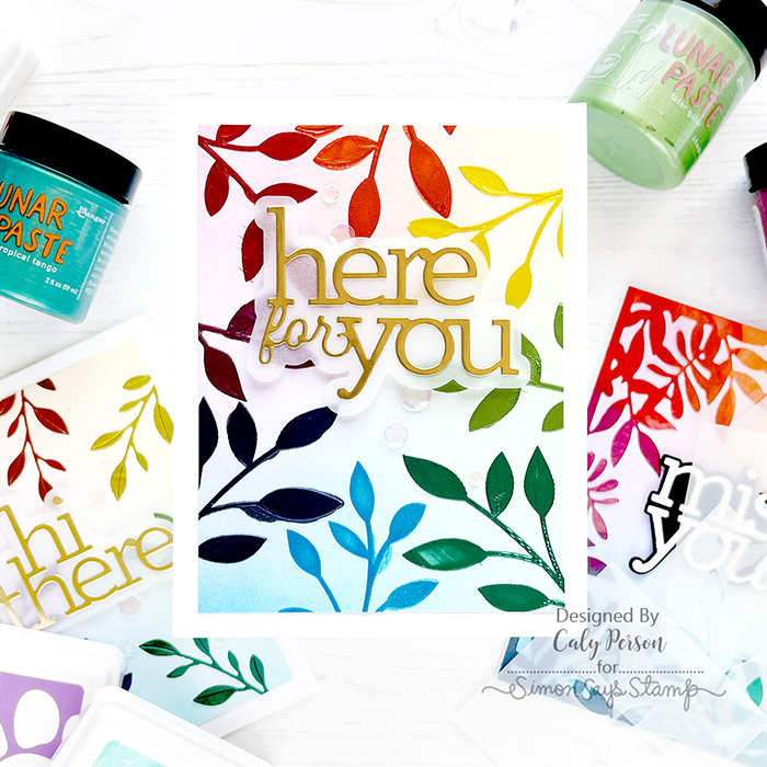 For my third card, I stenciled the pastes on using the Leaves stencil set. This card uses the Here for You sentiment.