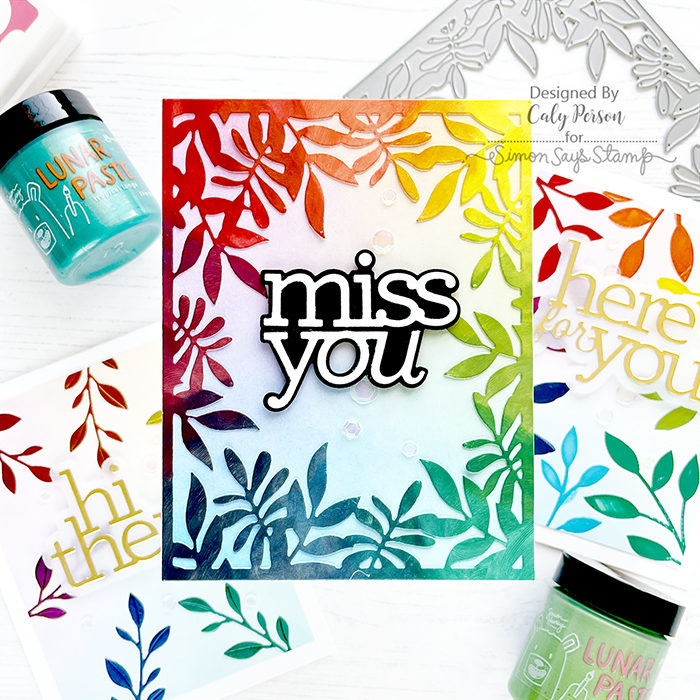 The second card uses Lunar Pastes over white cardstock.  I rubbed the colors onto a white panel and once dry, I used the Leafy Frame Die to die-cut the panel.  This card is paired with the Miss You sentiment.