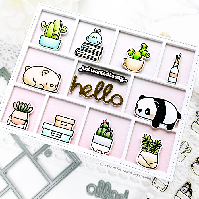 I die-cut the Grid Planter four times and adhered them together for height. On my card base, I masked off one half and ink-blended the other with Cheeky Pawsitively Saturated Ink. I adhered my stacked Grid Planter over the ink-blended panel.