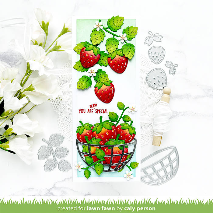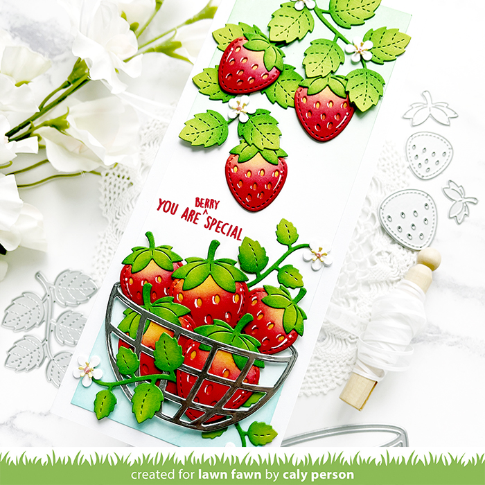 My card features the Strawberry Patch die. I paired it with smaller foliage and flowers from the Stitched Strawberry Frame die. I die-cut my strawberries, foliage, and flowers using colored cardstock and ink-blended with coordinating colors to add depth.