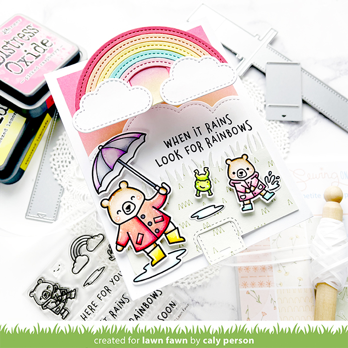 Today’s card also features the Here for You Bear set. I paired this sweet bear with the Beary Rainy Day bear. When I saw the sentiment on the Here for You Bear set, I just knew i had to make a rainbow pop up! I stamped and colored the images with Copic markers.