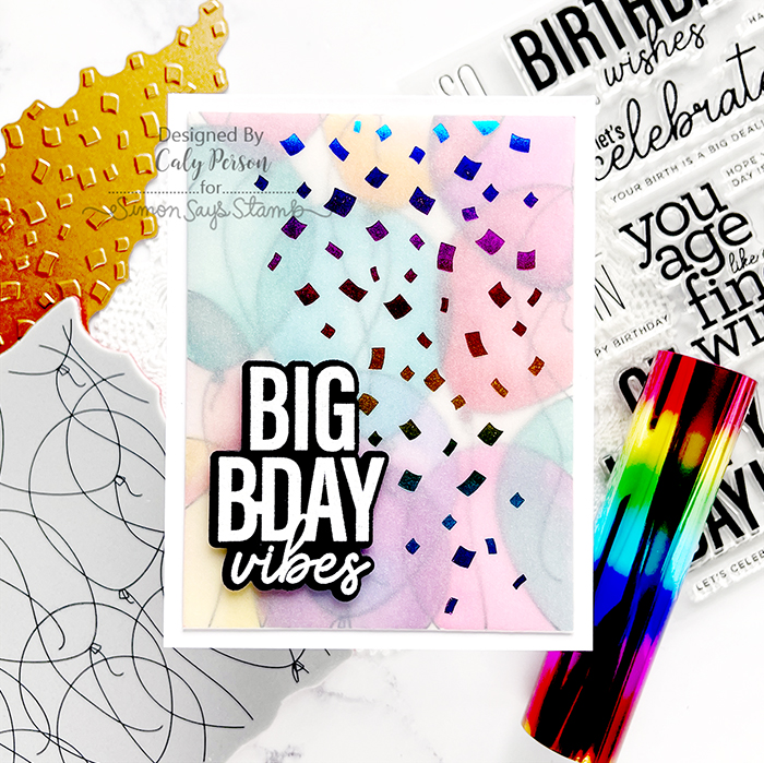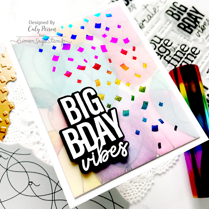 My card today uses a few new products from this release. Right off the bat, I foiled the new Mini Slimline Falling Confetti Hot Foil Plate over vellum using Rainbow Hot Foil.