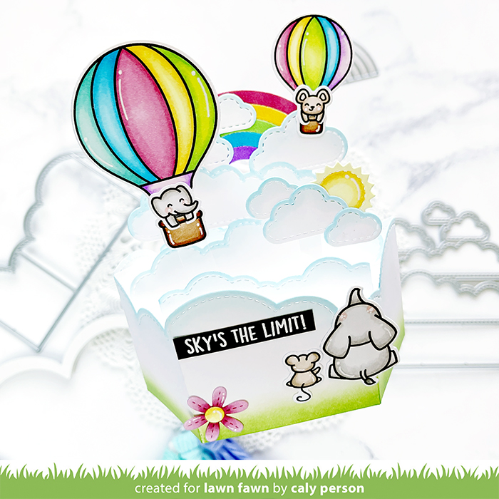 I die-cut all the pieces using white cardstock and colored the clouds with blue Copic markers to give them shading. For the bottom of the box, I ink-blended Mowed Lawn Distress Oxide Inks.