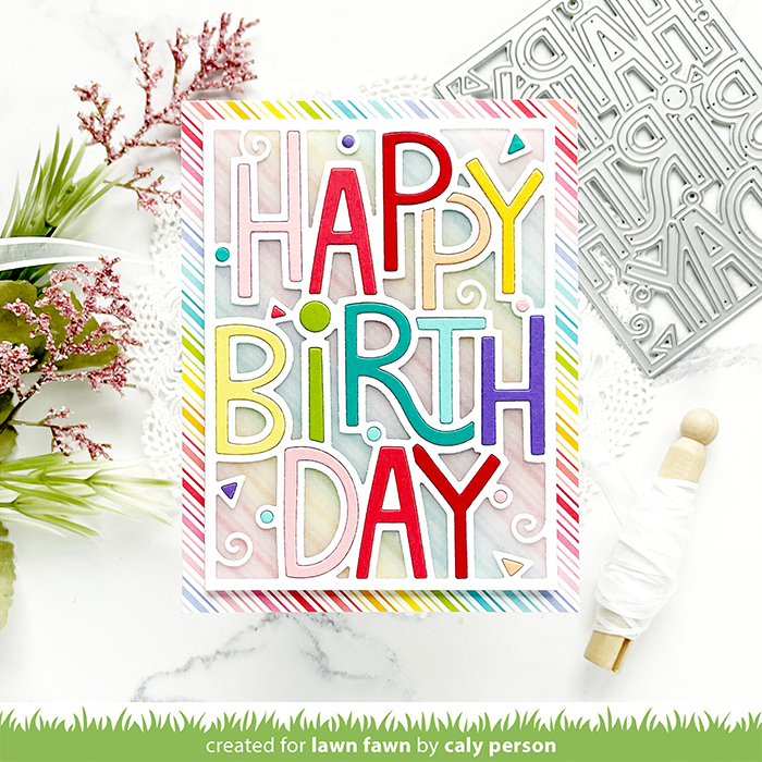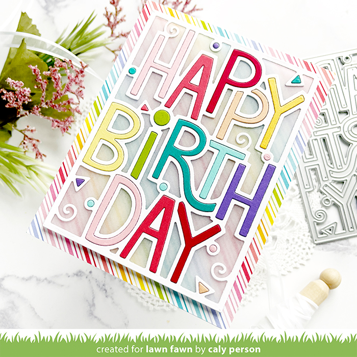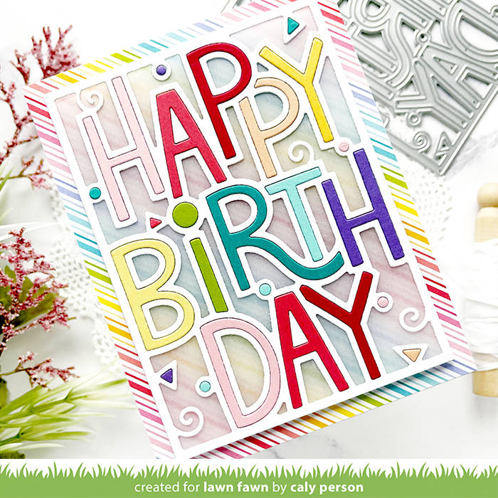 Today is the final day for Lawn Fawn’s March Inspiration Week! Today’s card features the Giant Outlined Happy Birthday dies. As always, there are two orientations to this die design – landscape and portrait. My card uses the Giant Outlined Happy Birthday Portrait die.