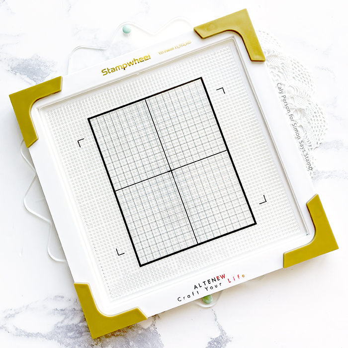 To make lining up easy, as you can see, I’ve added some A2-sized markings on my transparent photopolymer sticky mat, using an A2-sized Grid Transparency. The grid side of the sticky mat faces down into the Stampwheel base, so I used a permanent marker to add my markings on that side.