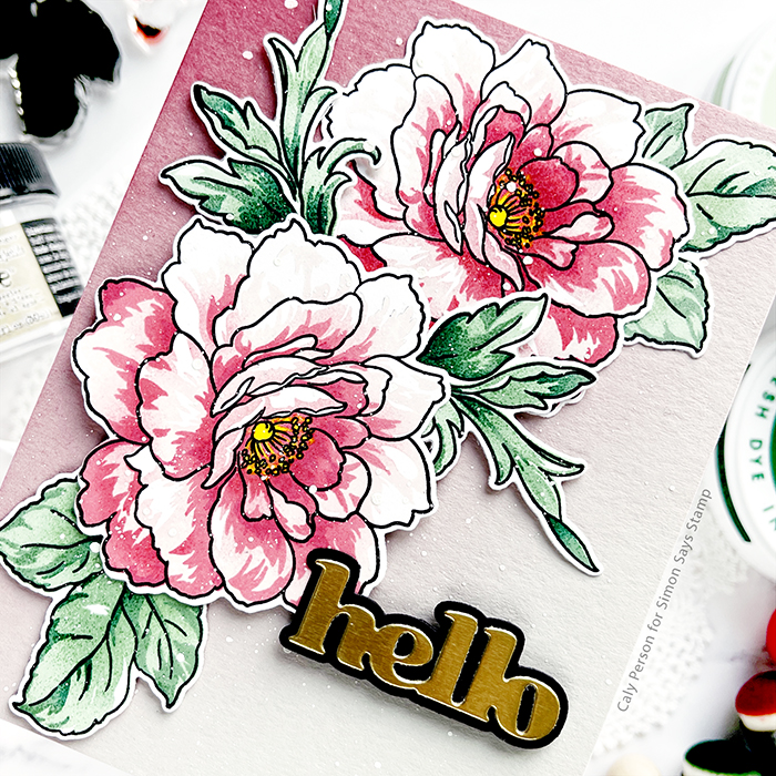 For the background, I ink-blended some ink at a diagonal using the darkest color used on the flowers. After attaching my images with different depths of foam adhesive, I splattered the panel with white paint. To finish, I put together a sentiment using the Altenew Versatile Greetings die set.