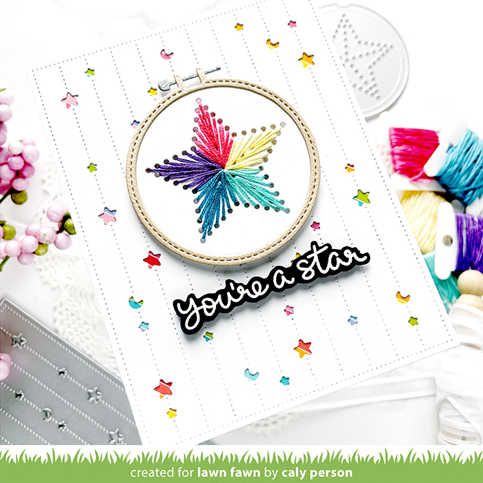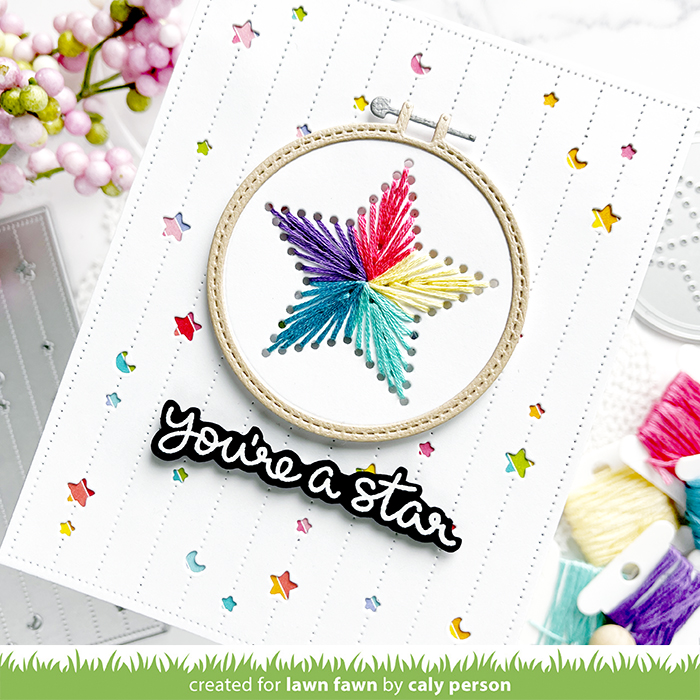 I have a simple card to share for Lawn Fawn Inspiration Week today! We have a new Embroidery Hoop Star Add-On die! The Embroidered Star is simple and can be made colorful and fun too!